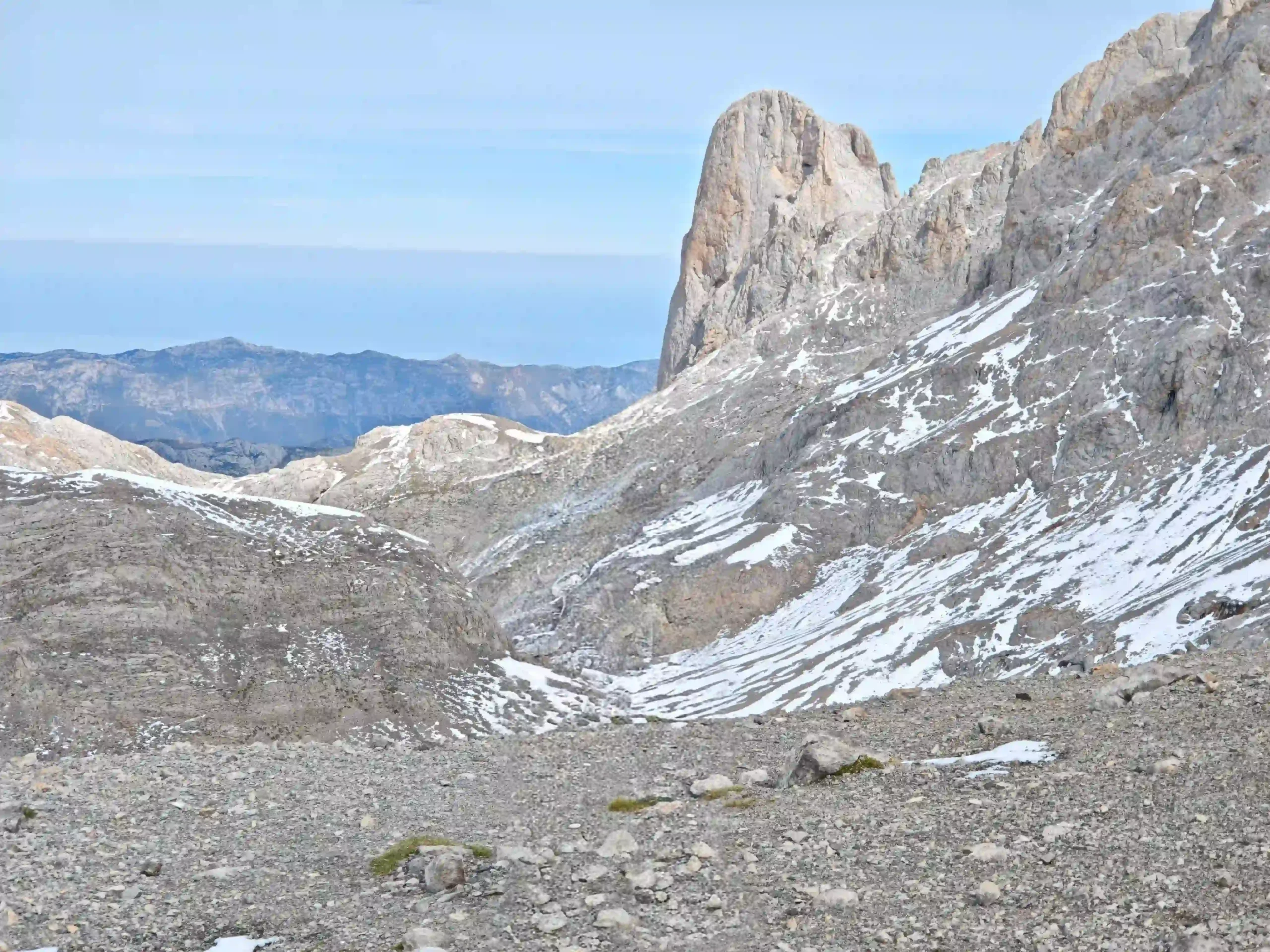 Al alcanzar el collado (2.343 m), la perspectiva cambia. Te asomas a un balcón natural donde el terreno cae verticalmente hacia el Jou de los Boches. Es el punto donde el olor a roca caliente por el sol se mezcla con el aire más limpio que vas a respirar en Cantabria. Desde aquí, si el día está claro (sin el típico «nublo» que cierra la visibilidad en minutos), el Naranjo de Bulnes o Picu Urriellu aparece al fondo como un diente de caliza perfecto.